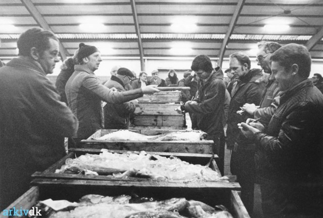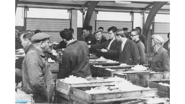 Foto: Arkiv.dk / Hirtshals Fiskeauktion 1965 hvor der for første gang i løbet af et år var solgt for mere end 100 mill.