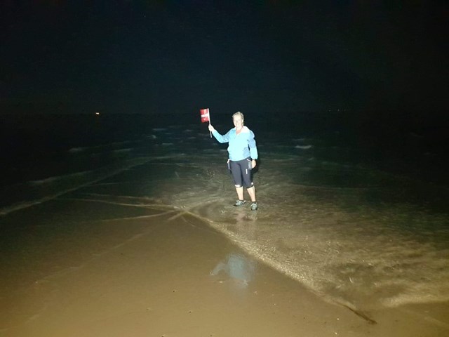 Der blev flaget med Dannebrog, da Anne Mette og Jan Larsen havde taget turen fra Hirtshals til Skagen, for at heppe på mig da jeg kom i mål. Anne Mette Larsen havde også gået med på 2 tidligere etaper.