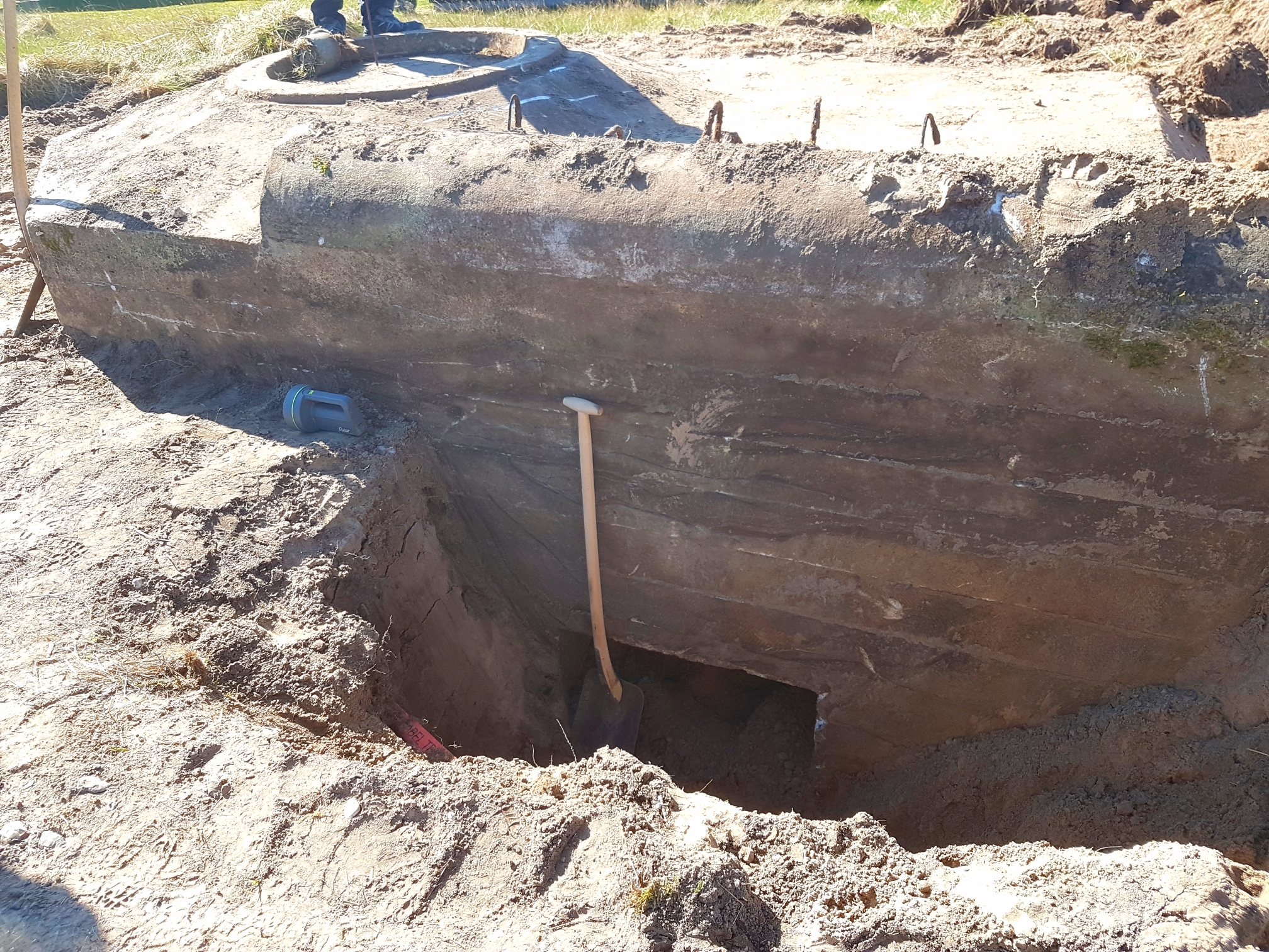 Det gamle dæksel blev brudt op og ligeledes påbegyndte man at grave sig helt ned til bunden af indgangen, der lå hele 2.20 under overfladen, hvilket gav lidt udfordringer med afstivning fra den nærliggende grusvej, der gik blot 70 cm fra bunkeren.